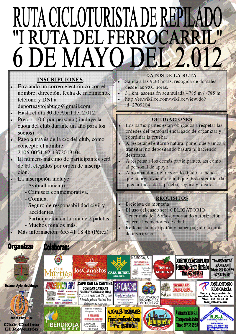El próximo día 6 de mayo, el Ayuntamiento de Jabugo y el CC Reventón, organizan la I RUTA DEL FERROCARRIL de El Repilado, os adjunto el cartel de la ruta con toda la información, también lo tenéis en el blog del club.